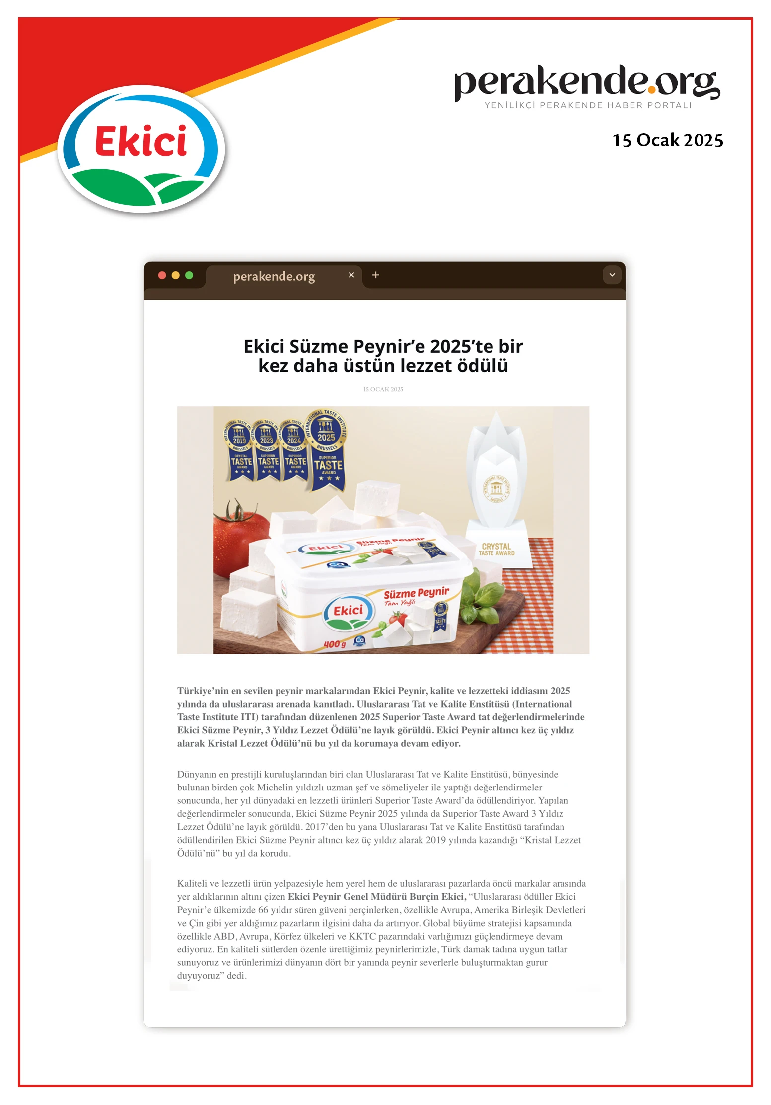 - Ekici Süzme Peynir’e 2025’te Bir Kez Daha Üstün Lezzet Ödülü